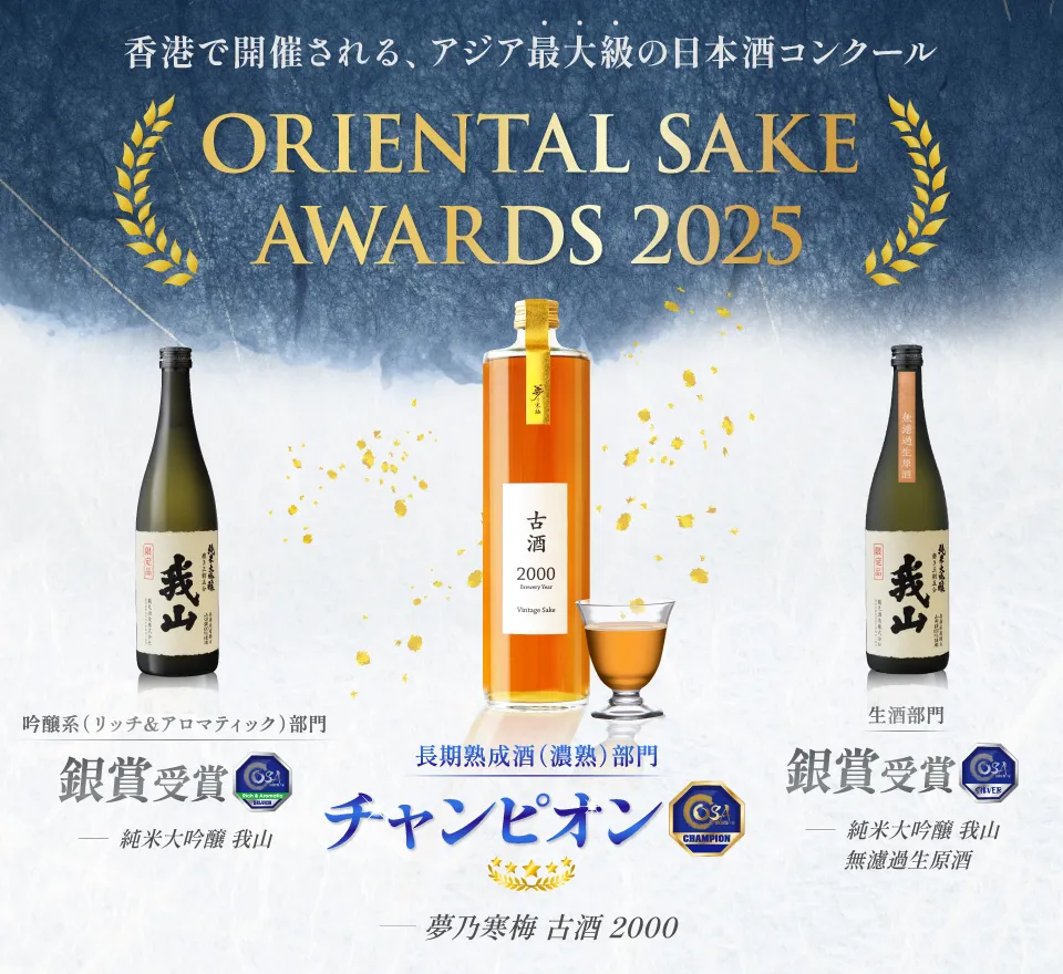 香港で開催された「オリエンタル酒アワード2025」において、【夢乃寒梅 古酒2000】が長期熟成酒(濃熟)部門にてチャンピオンを受賞いたしました。
