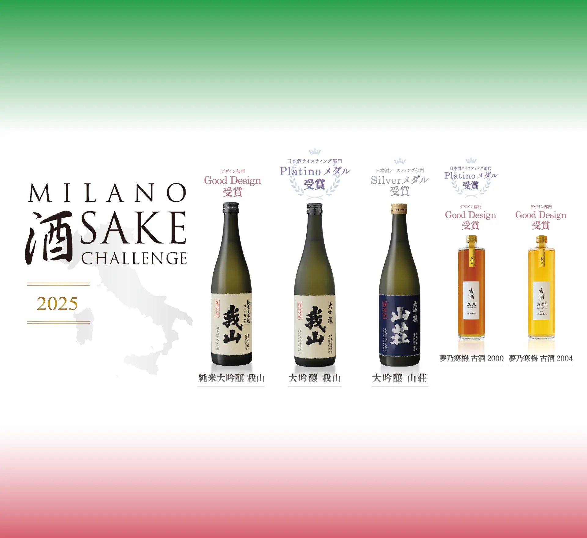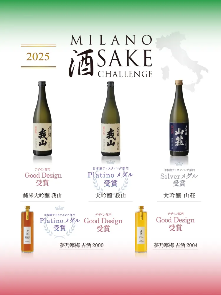 イタリア・ミラノ酒品評会「Milano Sake Challenge 2025」において、【大吟醸 我山】【夢乃寒梅古酒2000】がプラチナ賞、【大吟醸 山荘】がシルバー賞、【純米大吟醸 我山】【夢乃寒梅古酒2000】【夢乃寒梅古酒2004】がグッドデザイン賞を受賞