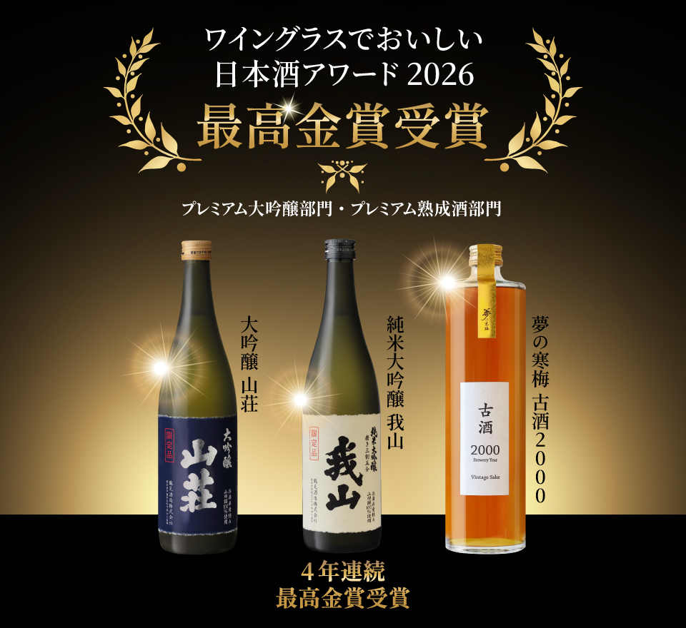 【純米大吟醸 我山】【大吟醸 山荘】【夢の寒梅 古酒 2000年】が最高金賞を受賞致しました。2月24日(火) 、森下文化センター(東京都江東区)で開催された「ワイングラスでおいしい日本酒アワード2026」において、「純米大吟醸 我山」がプレミアム大吟醸…